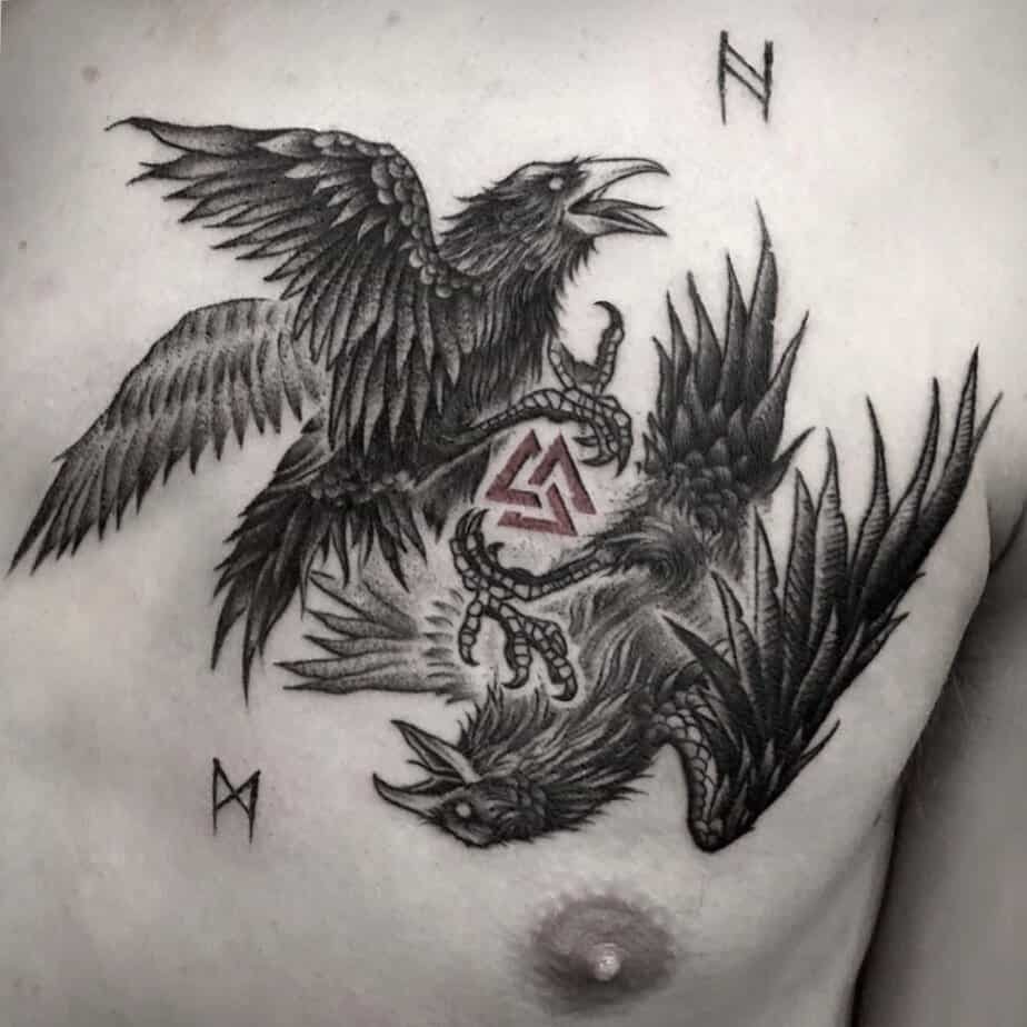Huginn and Muninn circling a Valknut is such a classic combo. The ravens are Odin’s messengers, flying between worlds, and placing them above the Valknut makes the whole piece feel like it’s listening for truth. It’s clever and layered — a tattoo that looks thoughtful without trying too hard.