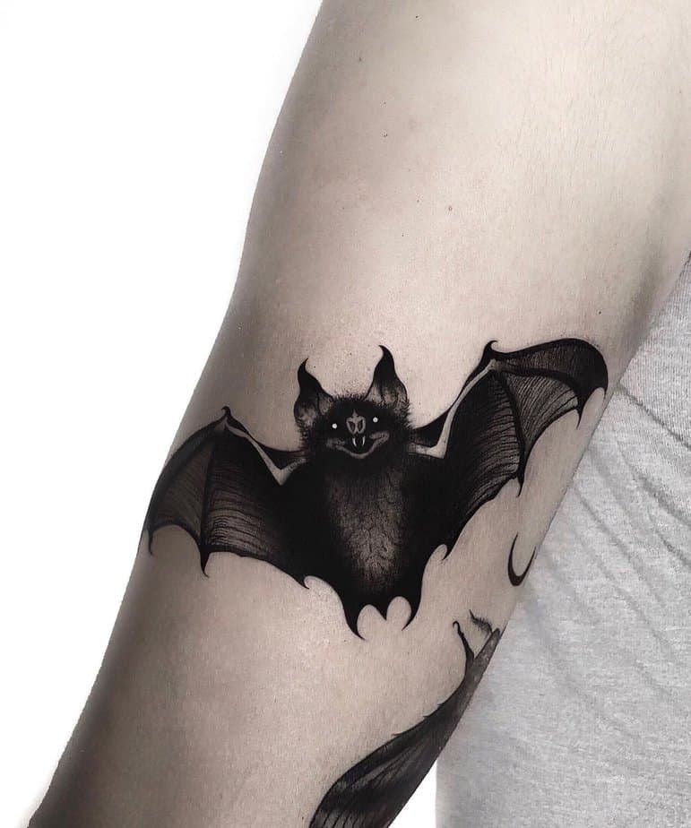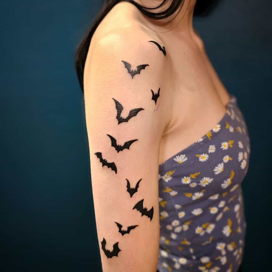 A flock of bats flying up an arm creates movement and mystery. Simple, elegant, and symbolic — great for subtle storytelling through negative space and silhouette.