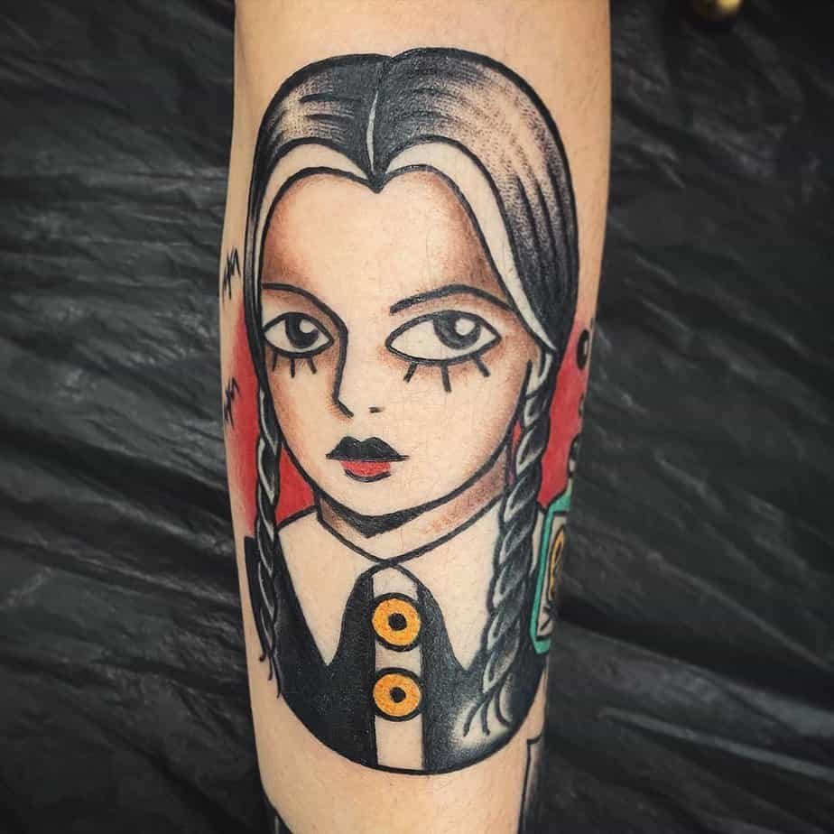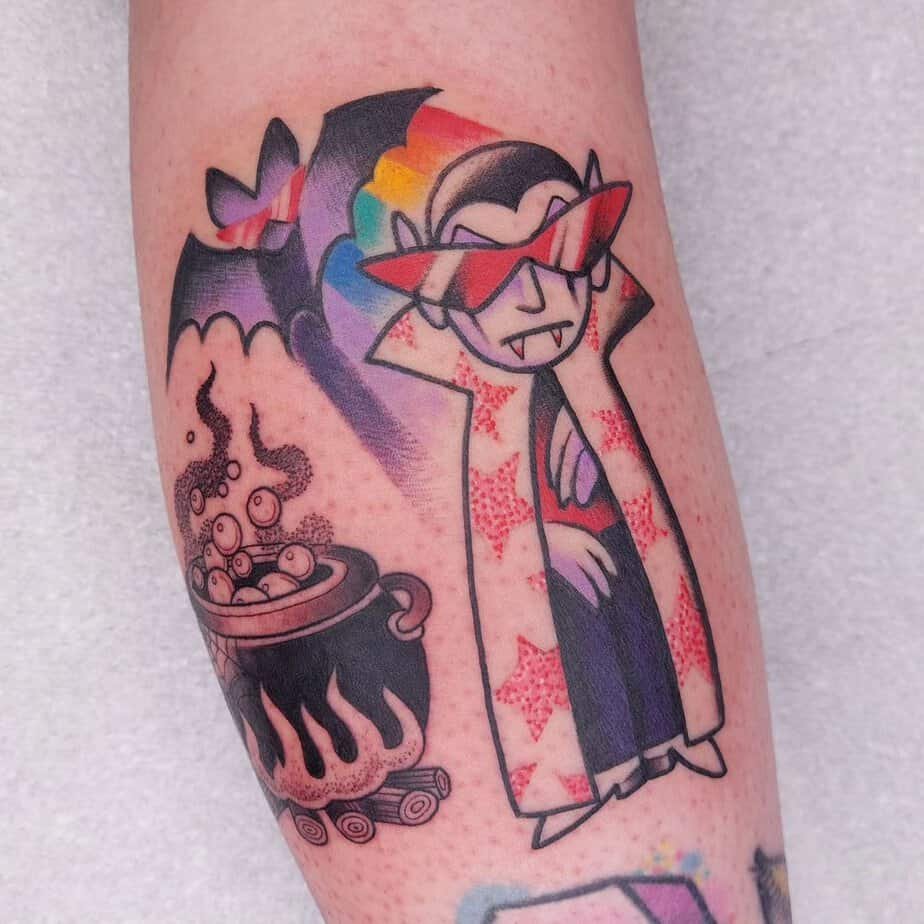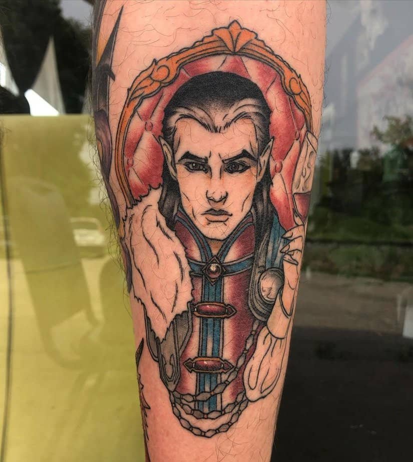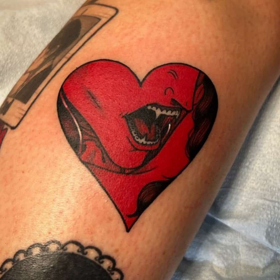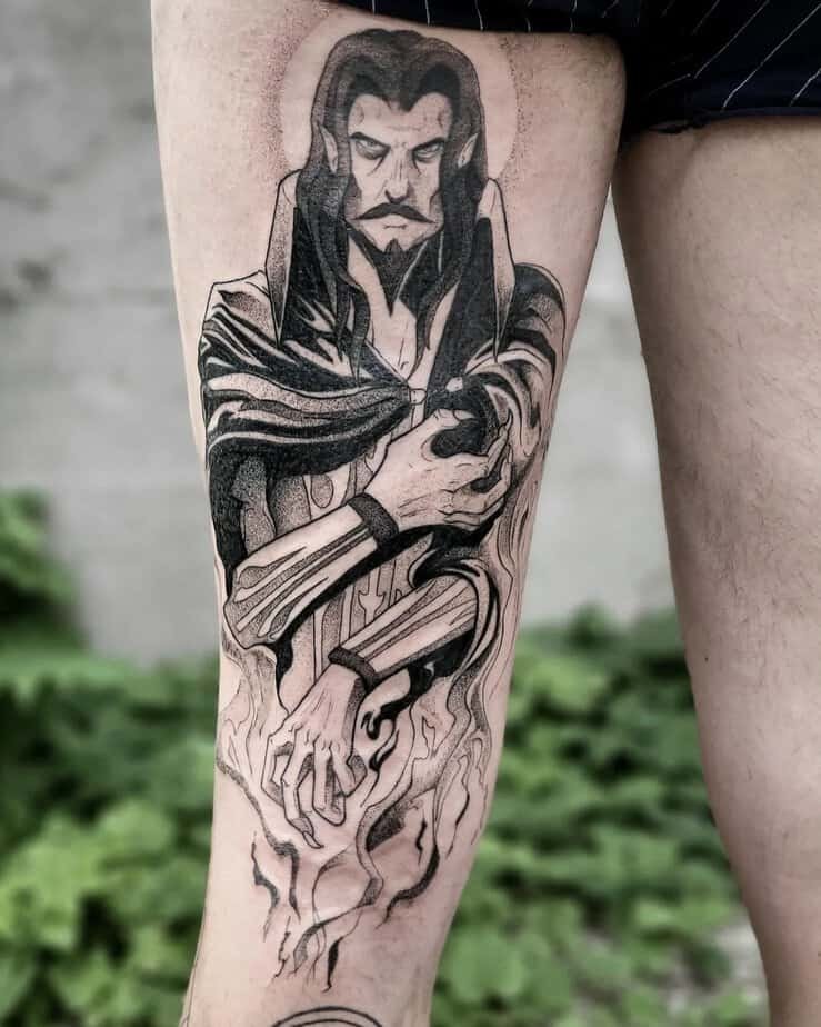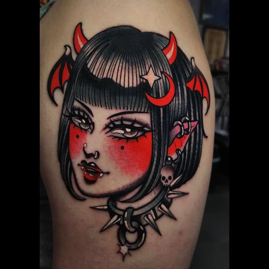 This fierce vampire mistress brings big, bold energy. Sharp features, a devilish smile — it’s the kind of tattoo that announces itself. If your aesthetic leans dark and powerful, this design feels like a mood board come to life.