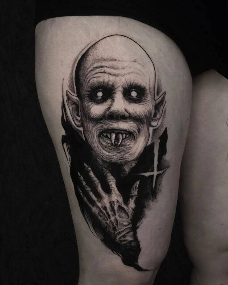 This Nosferatu piece is pure vintage creep in the best way — those hollow eyes and skeletal hands give you classic-horror chills. If you love the old black-and-white films and want that eerie, historic vibe etched into your skin, this is the mood: timeless, creepy, and totally iconic.