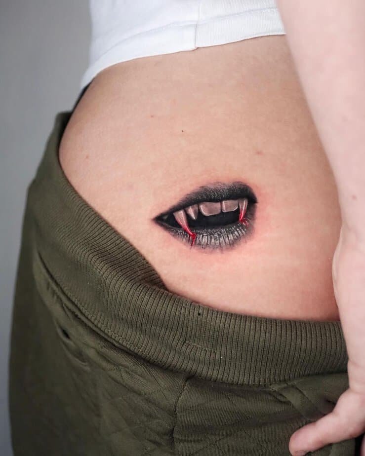 This cheeky tattoo of fangs peeking out from under a waistband is playful and kind of sexy. It’s subtle but cheeky — perfect if you want something that’ll make people grin and ask about the story behind it.