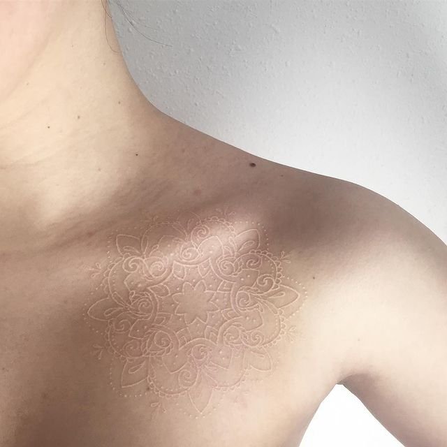 A white mandala on the collarbone looks like a tiny compass for your inner calm — intricate, balanced, and quietly feminine. It’s the kind of piece that invites a breath and a pause whenever you see it.