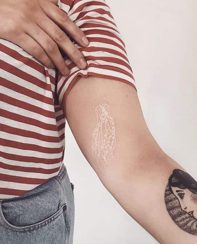 A white jellyfish floating in fine lines is mesmerizing — tender, intuitive, and oddly peaceful. It suggests depth and mystery, a connection to the ocean’s calm. If you like tattoos that feel meditative, this one’s a vibe.