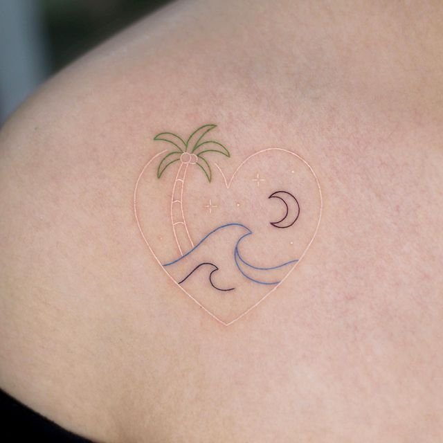 Tiny heart outline, mini ocean, a palm bending in the breeze and a little dark moon overhead — it’s like carrying a pocket-sized vacation. Perfect if the sea is your comfort or you want a reminder of calm days and surf sounds.